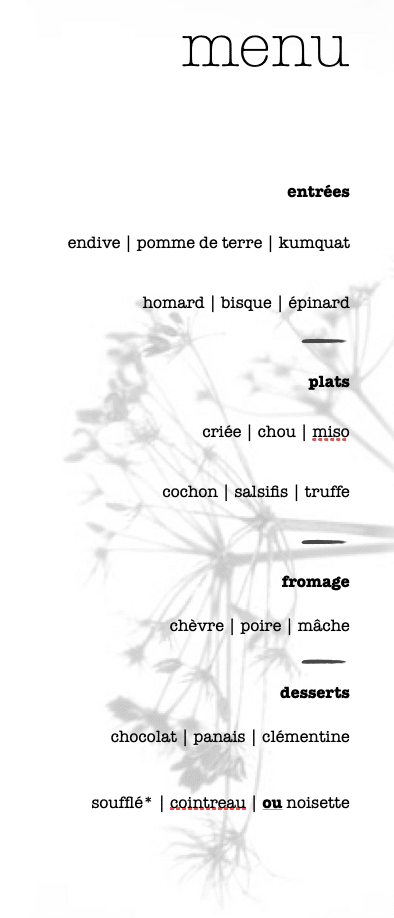 Le menu « spontaNÉ » (en 4 créations) : 70 euros